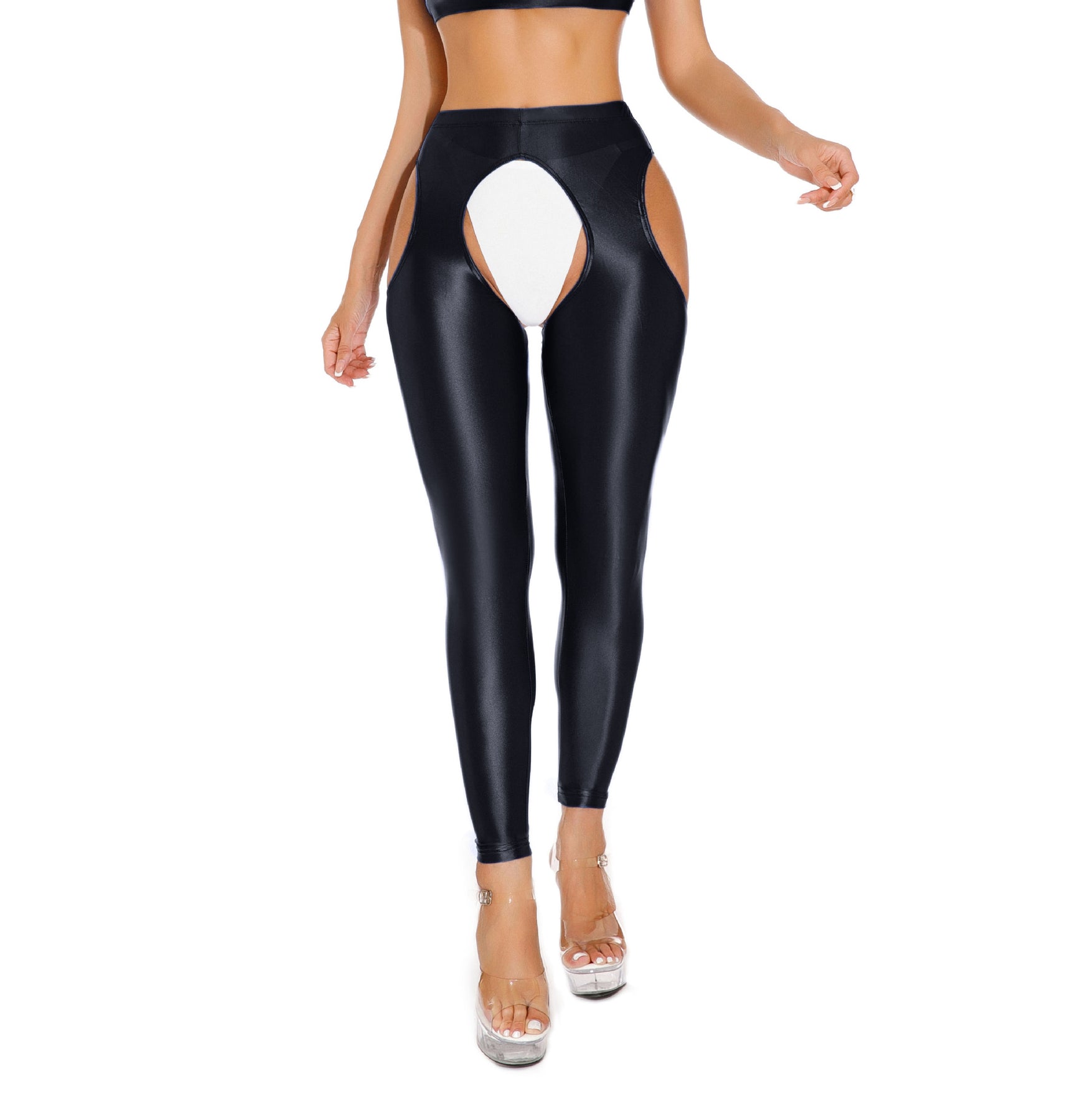 Indulge in the perfect combination of elegance and allure with these high-gloss open-crotch bodysuit tights. Crafted from silky smooth material, they hug every curve and accentuate your shape, creating a flawless, enticing look.