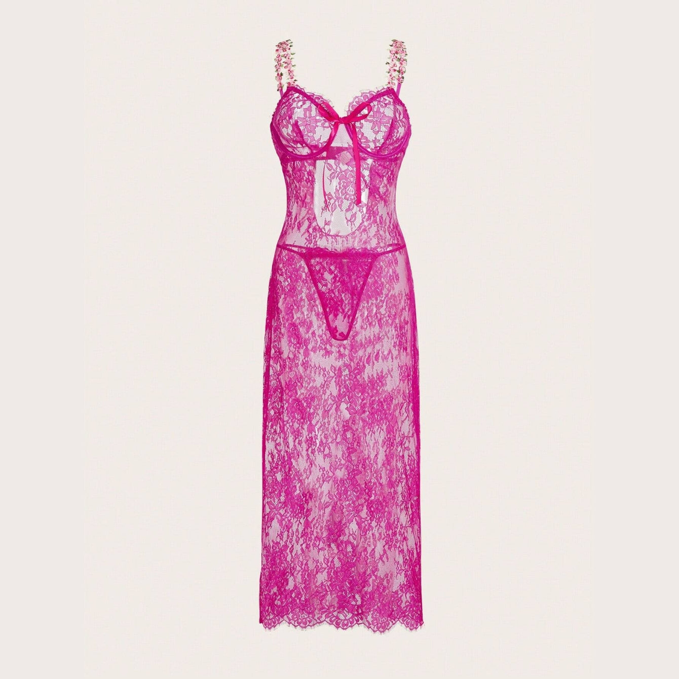 Barely there and built to mesmerize, this lace nightdress clings to your curves with a plunging V-neck and daring open back. The underwire cups lift and frame you perfectly, while the satin straps glide over your shoulders like a lover’s touch.
