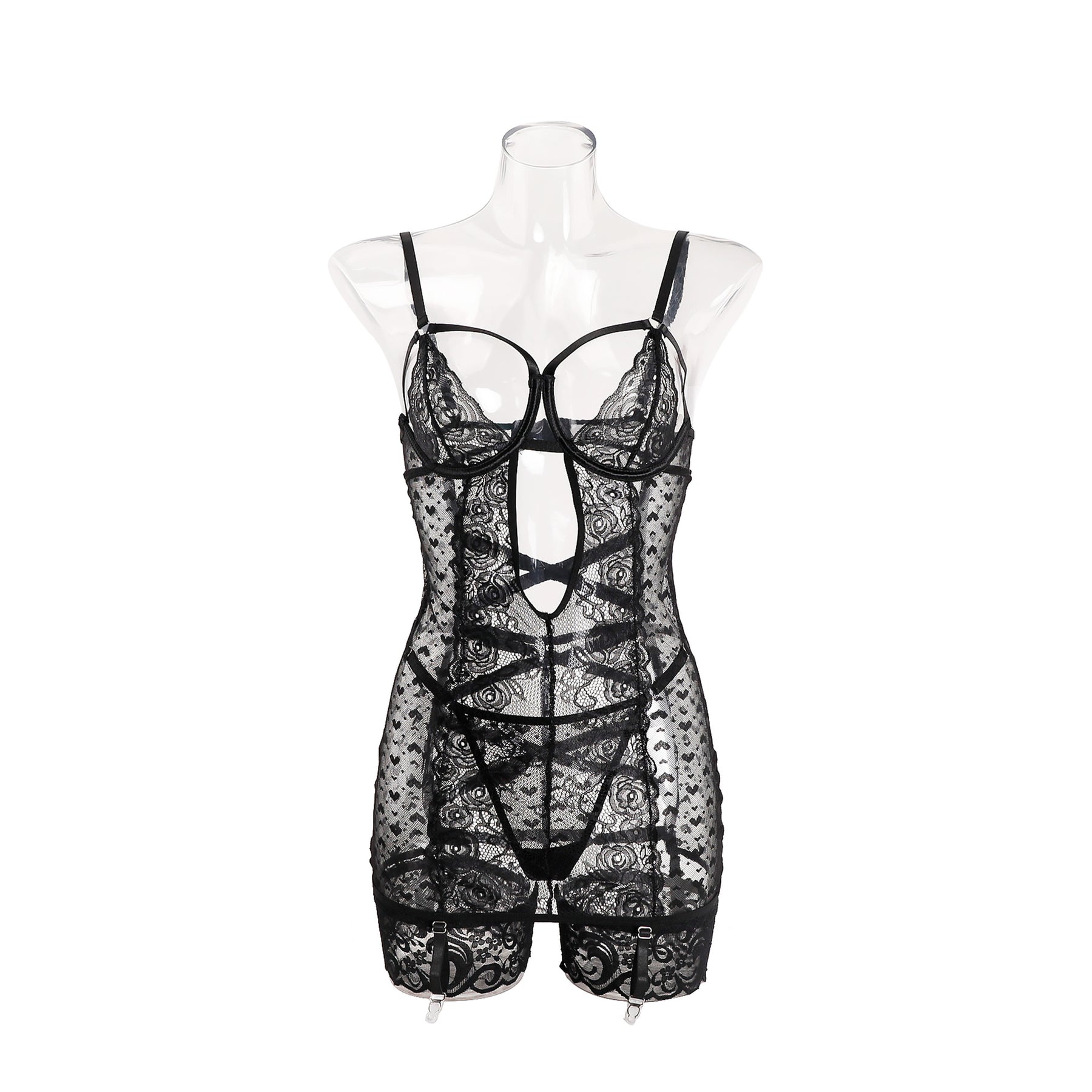 Designed to tease without revealing everything this lace embroidered slip set skims the body in sheer mesh and floral detail shaping curves and drawing attention with every slow movement The structured cups lift and frame while the open accents invite closer looks and wandering hands setting the tone before a single word is spoken