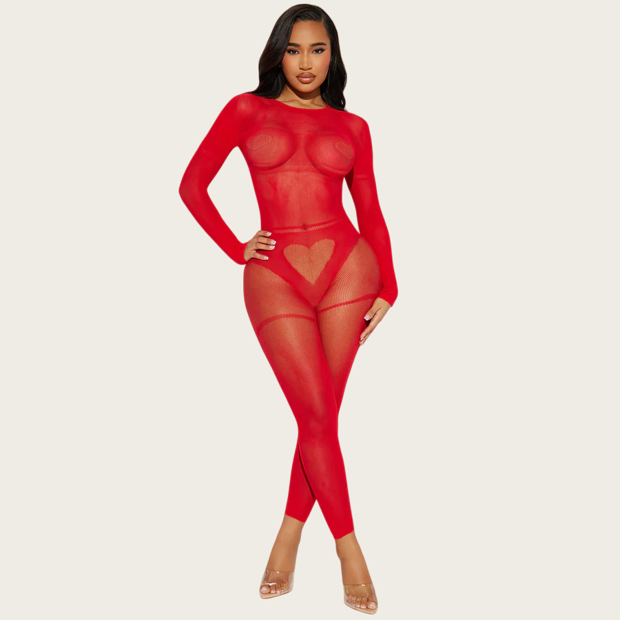 Slip into a second skin designed to be seen and slowly undone. This sheer mesh catsuit hugs every curve with strategic cutouts that tease the body beneath, creating a daring illusion from the front and an unforgettable open back that invites hands to wander. Stretchy translucent fabric moves with you, turning every step into a silent promise of what comes next.